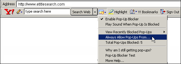 From now on, you will be able to use Parliamentary Data as normal. Yahoo! ToolbarThe pop-up blocker in the Yahoo! toolbar for Internet Explorer by default blocks all pop-ups, and therefore blocks eTitleSearch images. Make sure that the blocker is enabled, and then set it to "Always Allow Pop-Ups from..." eTitleSearch.com. The toolbar keeps a list of sites from which it has blocked pop-ups, and then allows you to choose from which of these sites you want to allow pop-ups.