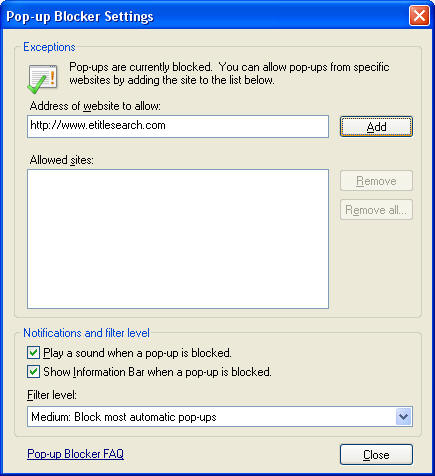 From now on, you will be able to view images as normal. Internet Explorer 6 & 7The Internet Explorer 7 browser includes a pop-up blocker that by default blocks most unrequested pop-ups,, and therefore blocks eTitleSearch images. The blocker allows you to stop blocking cookies from specific websites: