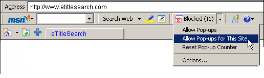 From now on, you will be able to view images as normal. MSN Pop-up GuardMSN Pop-up Guard is part of the MSN Toolbar for Internet Explorer. By default it blocks all pop-ups, and therefore blocks eTitleSearch images. First, go to the eTitleSearch website, click the black down arrow on the pop-up blocker, and click “Allow Pop-ups for This Site” on the menu.